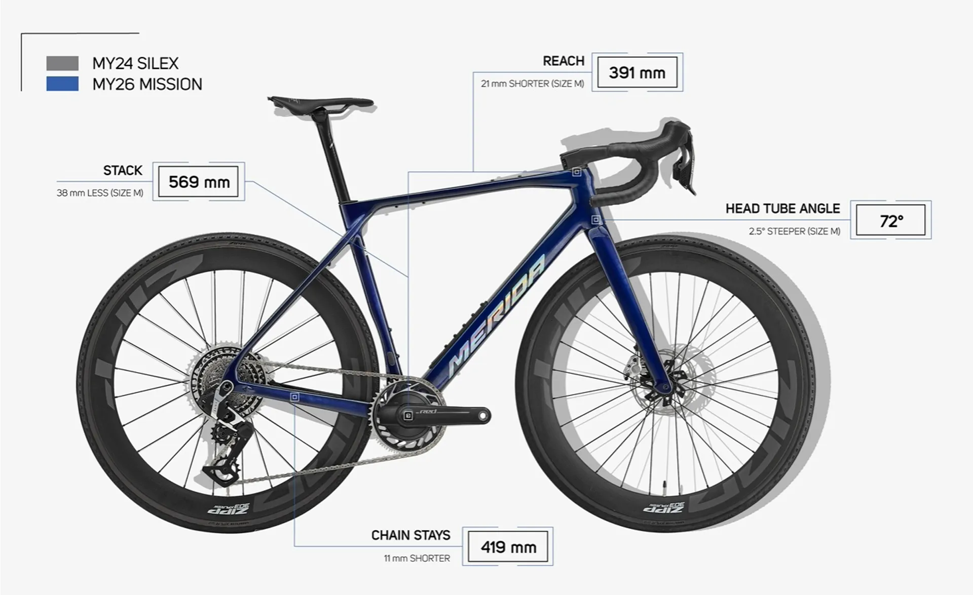 A 72˚ head angle provides more control on rough surfaces without becoming sluggish. Similarly, the 391mm reach keeps the bike sporty and agile on any surface. The stack height of just 569mm compared to 584mm on the Scultura Endurance and 607mm on the Silex offers a more race-oriented position, ideal for gravel racing and fast multi-surface sessions. Finally, the low bottom bracket gives the Mission enhanced stability and control away from tarmac roads. It gives the rider the feeling that they are sitting "in the bike" rather than on top of it, massively improving the handling, stability and providing confidence on technical sections and descents, due to the low centre of gravity.