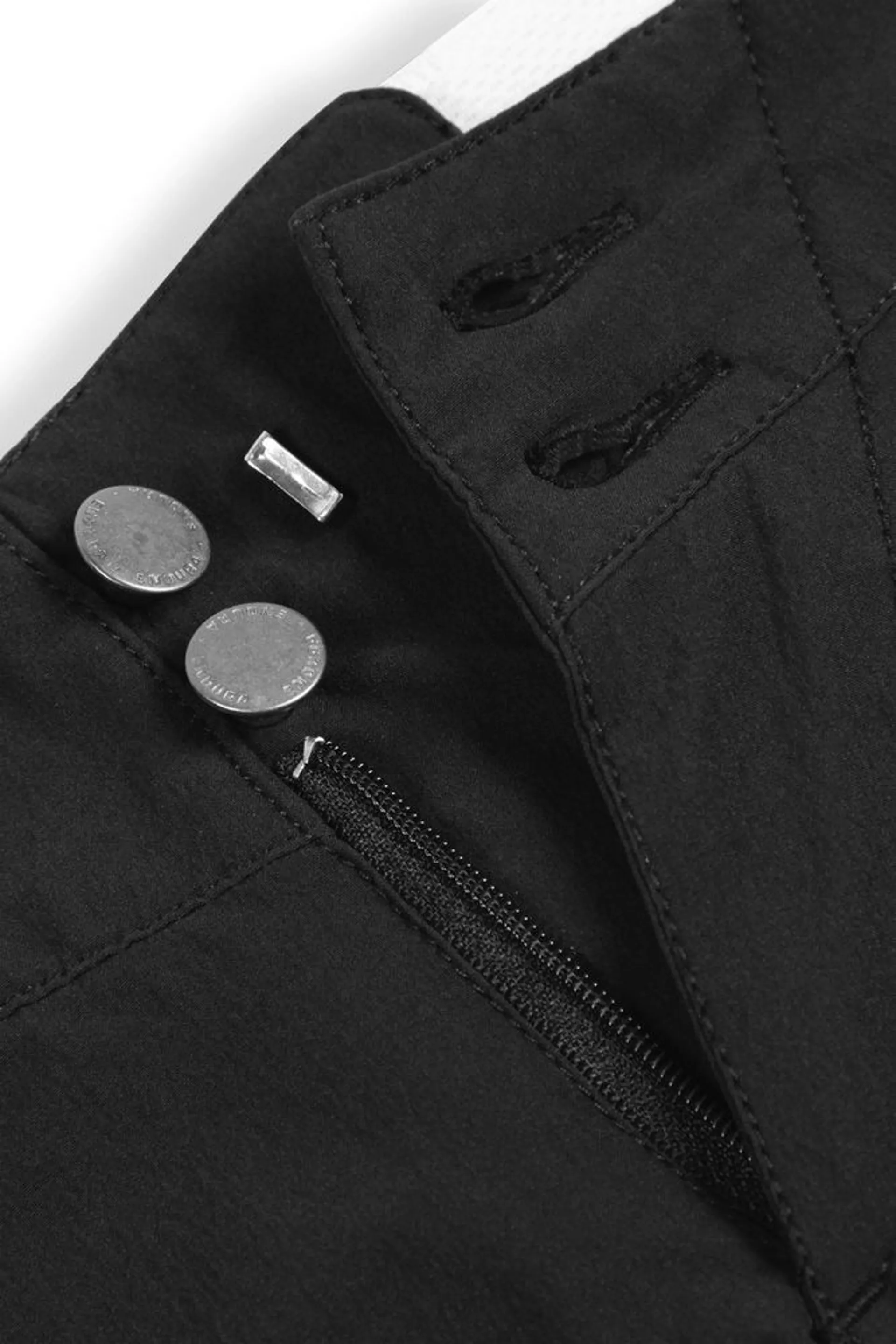 - Front zip fly with button closure and internal hook and bar fastening
