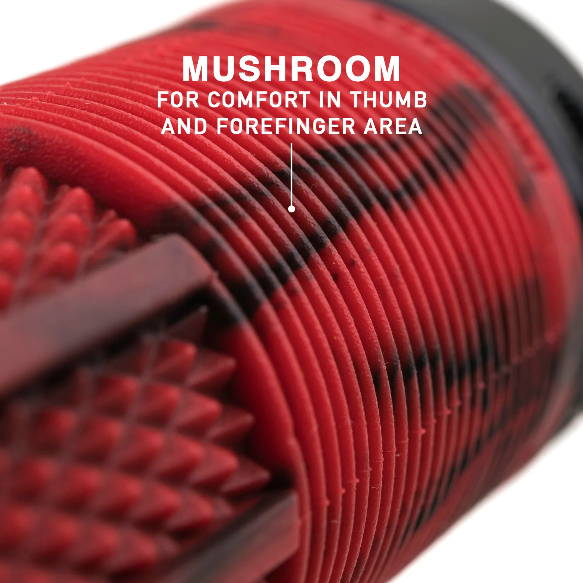 - Grip design: waffle and knurl for grip, mushroom for comfort